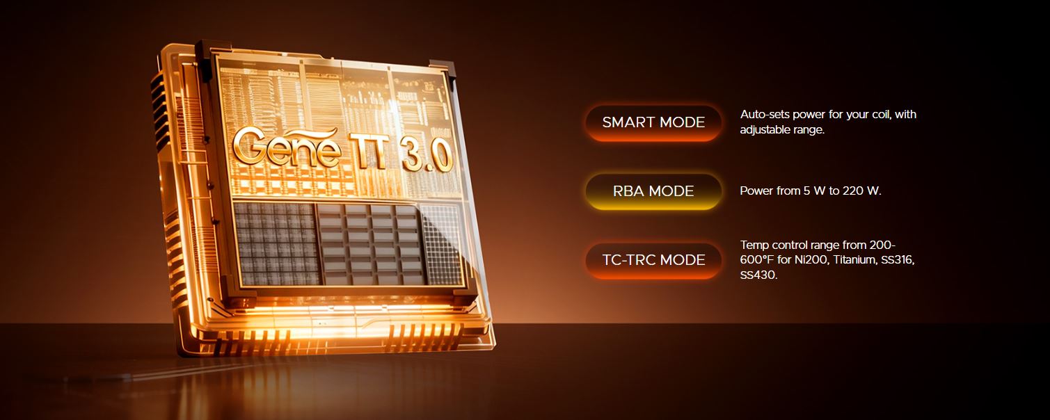 El GENE TT 3.0 es un chip que está diseñado para aumentar la seguridad y así, reducir riesgos. Es un sistema de optimización para una experiencia mucho más agradable. Desbloquea una experiencia personalizada con estos 3 modos: SMART MODE: ajuste automático de la potencia de la resistencia. RBA MODE: Potencia desde los 5 hasta los 220W, y, por último, TC-TRC MODE: Control de temperatura desde los 200 hasta los 600ºF.